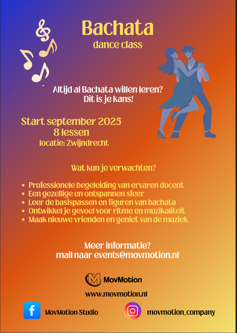 Of je nu je allereerste dansstap zet of al ervaring hebt op de dansvloer, onze Bachata-cursus in Zwijndrecht is voor jou!